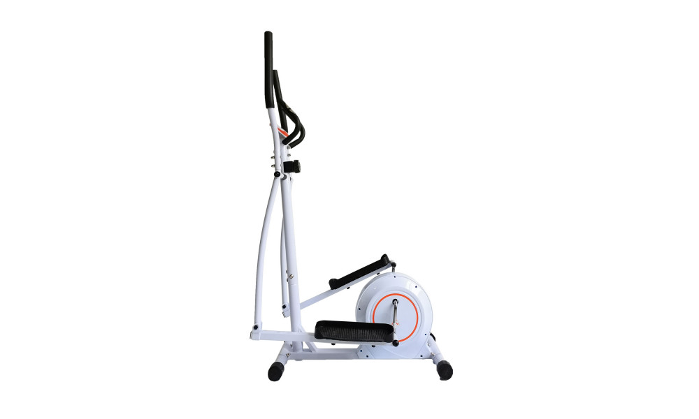 Эллиптический тренажер для домашнего использования. Модель с высокоскоростным маховиком и магнитной системой нагружения. Механическая (ручная) регулировка изменения нагрузки с помощью рукоятки на стойке тренажера. 8 промежуточных положений.