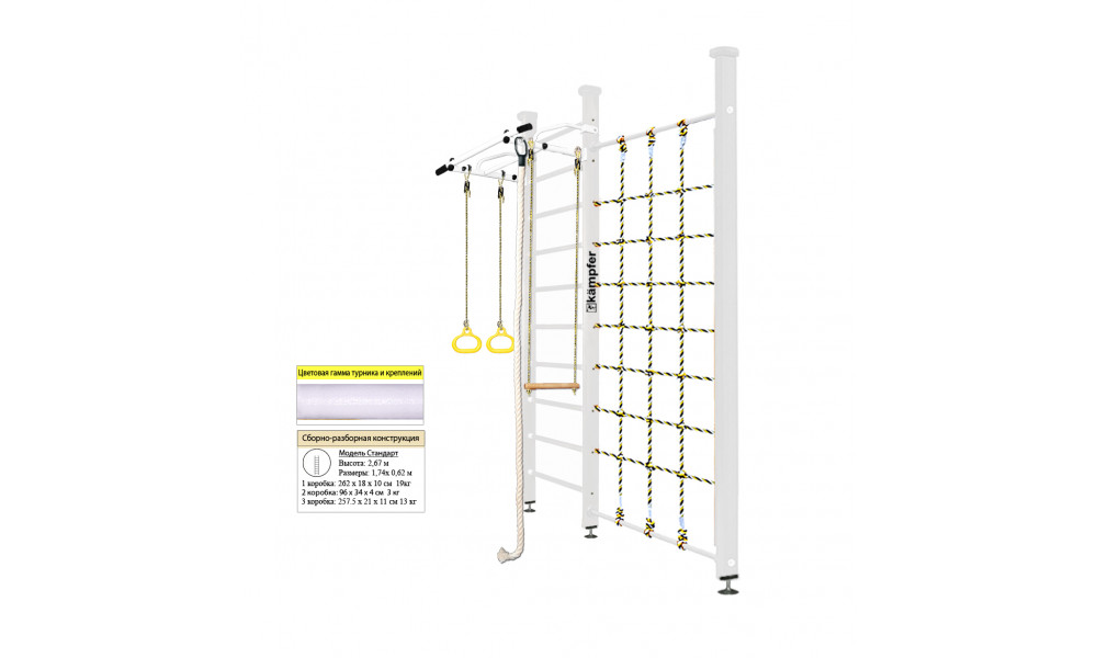 Детский спортивный комплекс Kampfer Winner Ceiling это новинка среди моделей из линейки домашних деревянных шведских стенок Kampfer. Модель Kampfer Winner включает в себя набор из самых популярных навесных аксессуаров канат, кольца и трапецию. Крепкий металлический турник выдерживает нагрузку до 120 кг, подходит как детям так и взрослым. Навесное оборудование Kampfer на прочных тросах выдерживает нагрузку до 100кг. Конструкция выполнена из натурального дерева, все края деталей немного скруглены обеспечивая большую безопасность для ребенка. В дополнении к основным аксессуарам в комплектации к Kampfer Winner идет канатный лаз - это прочная сетка шириной 90 см из крепкого шнура выдерживает нагрузку до 100кг. Стойка с сеткой Kampfer Winner значительно расширяет игровое пространство детской комнаты и позволяет разнообразить функциональность классической шведской стенки Kampfer.